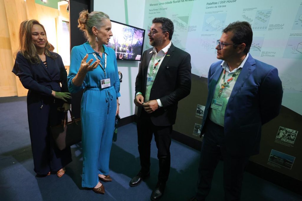 O governador Wilson Lima e o secretário Marcellus Campêlo visitaram, ainda, o pavilhão do Banco Interamericano de Desenvolvimento (BID), financiador do Prosamin+, que também está apresentando o programa como case de sucesso. Considerado pelo banco como emblemática na América Latina, a iniciativa reassenta populações de áreas de risco, promovendo saneamento básico e requalificação urbanística para mitigar os efeitos das alagações e melhorar a resiliência climática.