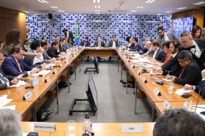 05/02/2025 - 12:56 Marina Ramos/Câmara dos Deputados Líderes reunidos com o presidente da Câmara (na cabeceira) nesta quarta Os…