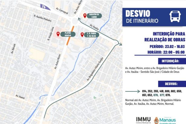 A Prefeitura de Manaus, por meio do Instituto Municipal de Mobilidade Urbana (IMMU), informa que trecho da avenida Autaz Mirim…